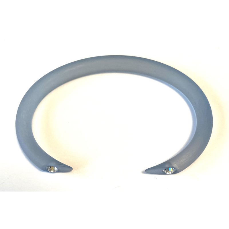 A thin Lucite bangle, shaped under heat, dipped in a color bath, with a Swarovski at each end.