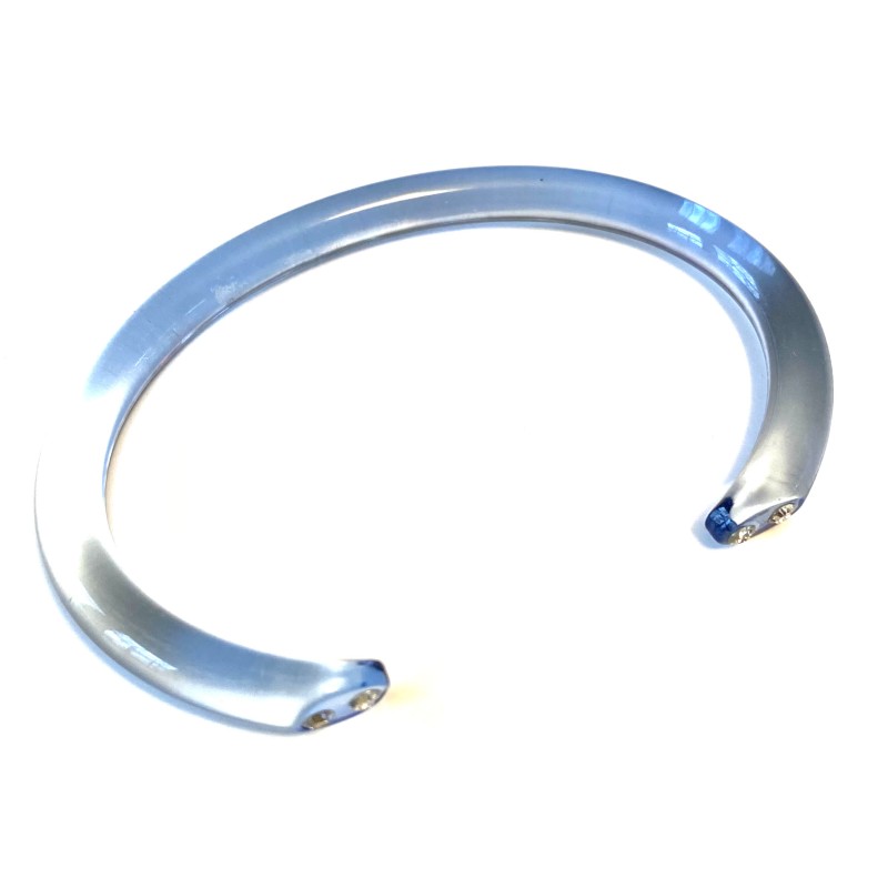 A thin Lucite bangle, shaped under heat, dipped in a color bath, with a Swarovski at each end.