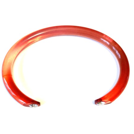 A thin Lucite bangle, shaped under heat, dipped in a color bath, with a Swarovski at each end.