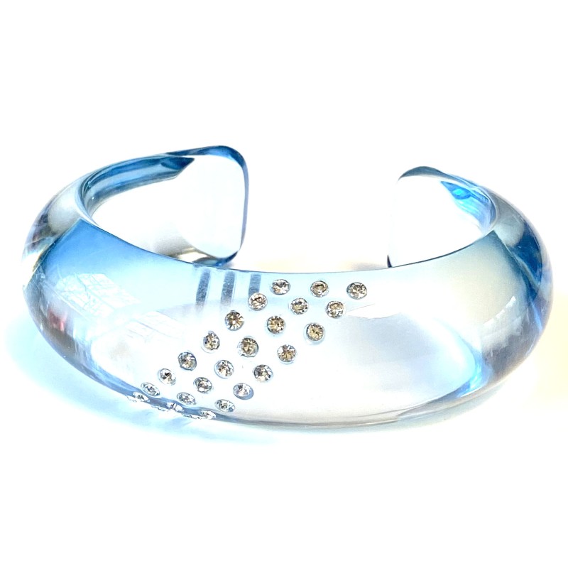 A dramatic XXL Lucite bangle, shaped under heat, inlaid with Swarovski crystal drilled by hand.