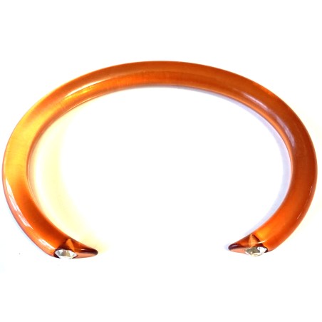 A thin Lucite bangle, shaped under heat, dipped in a color bath, with a Swarovski at each end.
