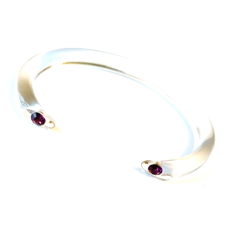 A thin Lucite bangle, shaped under heat, dipped in a color bath, with a Swarovski at each end.