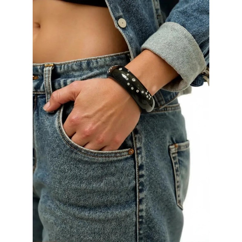 A dramatic XXL Lucite bangle, shaped under heat, inlaid with Swarovski crystal drilled by hand.