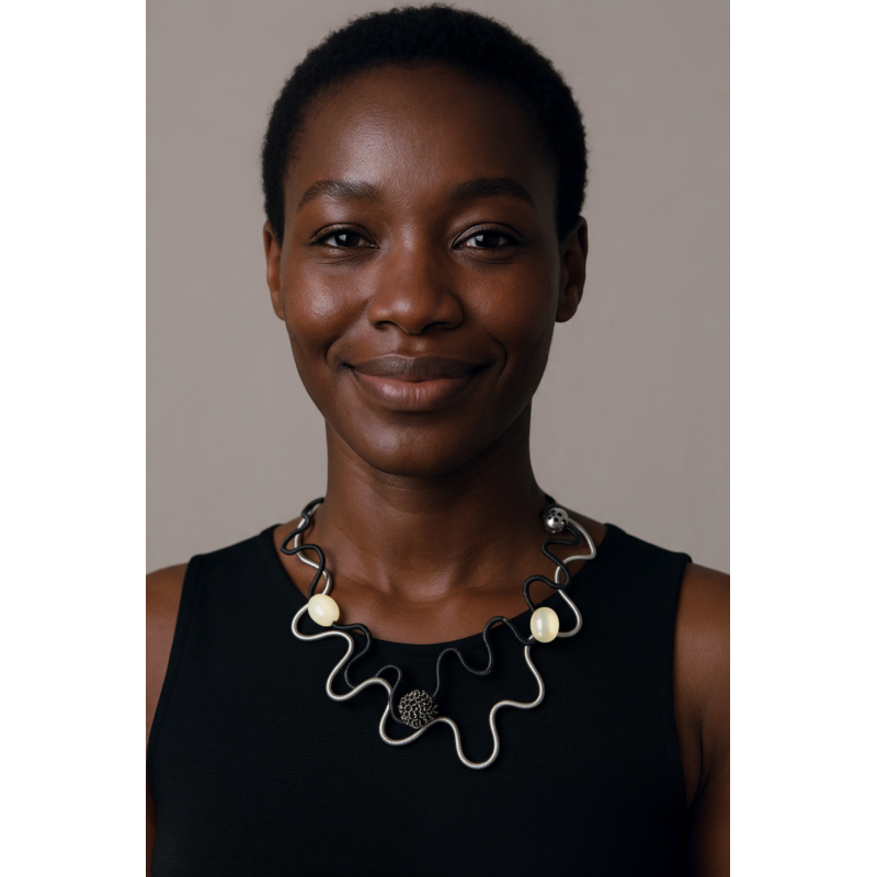 18" adjustable necklace w/ 2 hand coiled cords, pearls & metal elements.