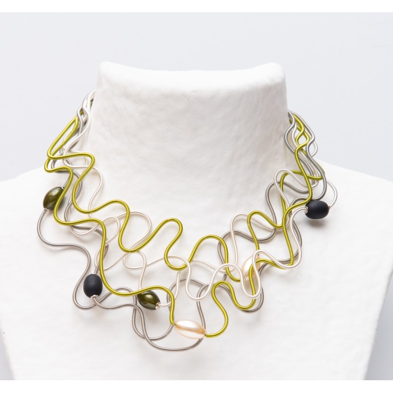 18" necklace w/ 5 hand coiled fine wires w/ small Polaris olives. Adjustable closure.