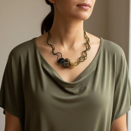 Asymmetric 18" necklace w/ hand coiled wires, and metal shell elements. Adjustable closure.