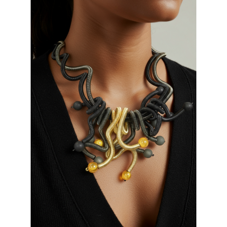 18" adjustable necklace with two hand coiled wire cords, with cluster of wrapped hand coiled wire "ties" w/ pearl ends.
