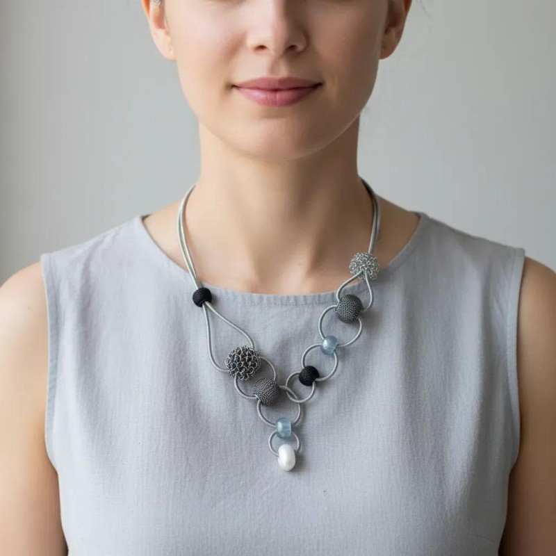 18" adjustable necklace w/ looped, hand coiled wire, rubber, metal & ceramic elements.