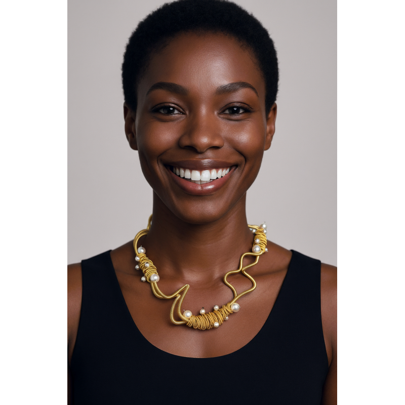 18" necklace - 2 hand coiled cords w/ pearls & wrapped coiled wire sections, adjustable closure.