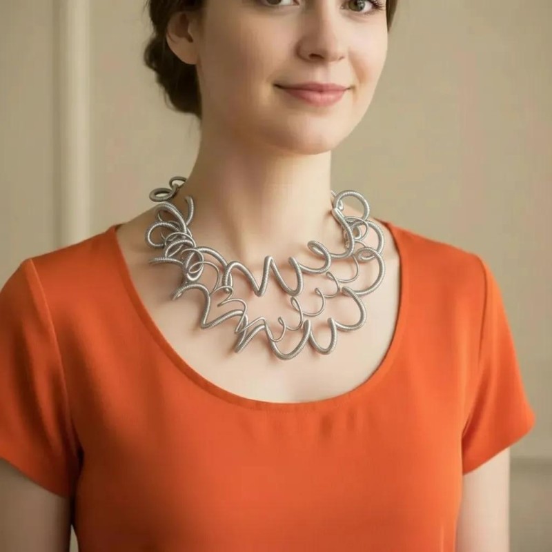 18" adjustable length necklace of 3 spiral coiled metal wires (thick & thin). Can be gently manipulated into a longer length & then gently returned to original size. Adjustable closure w/ extension chain.