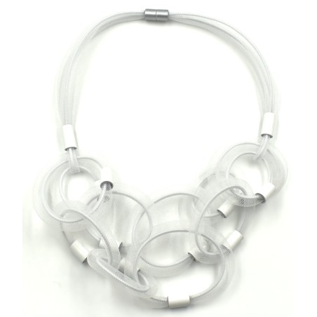 Experience modern elegance with this sophisticated 24" necklace, featuring transparent mesh loops anchored by a deeply colored inner cord for a striking 3D effect. Light as a feather yet visually distinctive, it offers beautiful floating movement that adds effortless grace to any outfit. Finished with a secure magnetic closure, this contemporary design blends texture, depth, and airy refinement for a look that stands out with subtle sophistication.
