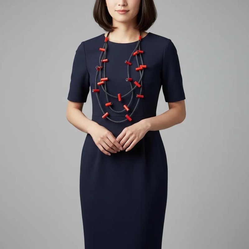 A very popular design made of anodized aluminum cylinders mounted on mesh threads for a long (24") easy to wear silhouette.