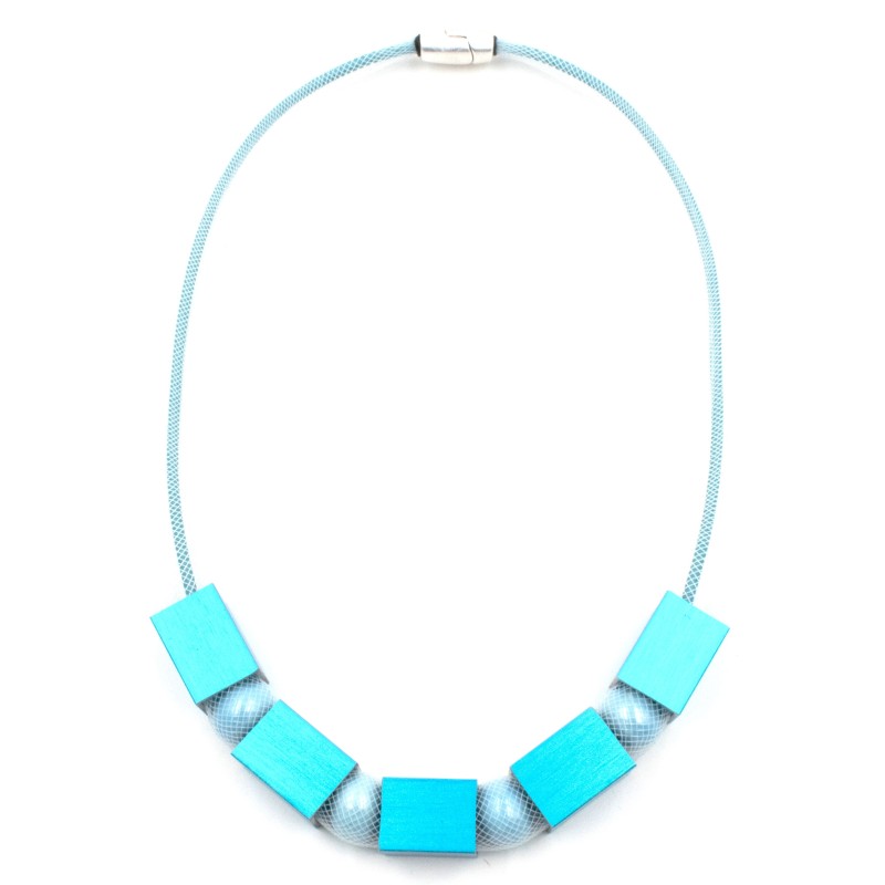 This clever contemporary necklace blends softness and boldness in one striking design. A delicate mesh sleeve holds smooth glass pearls for a classic, elegant feel, while brightly anodized aluminum cubes on the outside add a vibrant, assertive twist. Light, modern, and full of personality, it’s finished with a secure magnetic closure for effortless everyday wear. A perfect balance of refined and daring style.