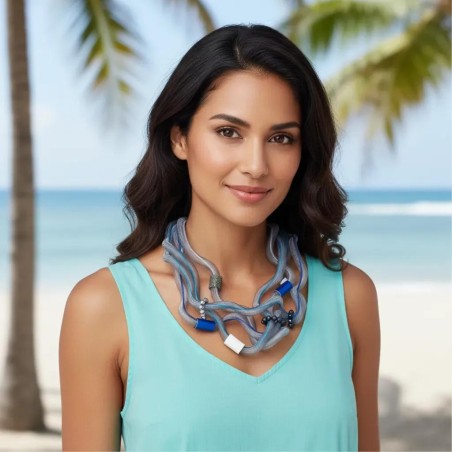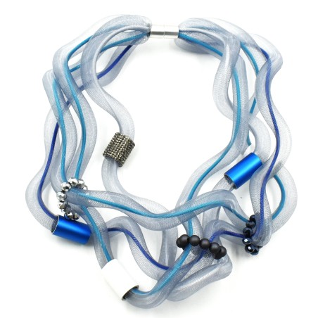 Ornamented with a refined mix of ceramic beads, anodized‑aluminum accents, and subtle strass highlights, the strands seem to float around the neck like a soft, colorful cloud. The effect is aerial, diaphanous, and barely there, yet impossible to overlook.