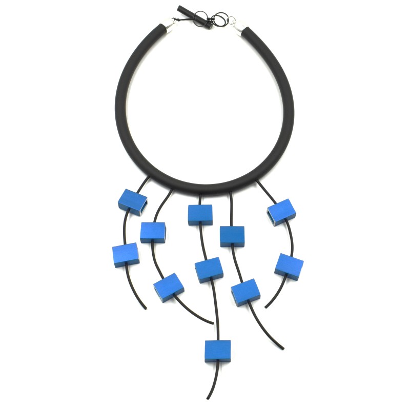 Make a bold modern statement with this striking necklace featuring a waterfall of anodized‑aluminum cubes that appear to float effortlessly along soft rubber strings. The cascading cubes create dynamic movement and eye‑catching dimension, showcasing the rich, velvety colors and lightweight feel of anodized aluminum.