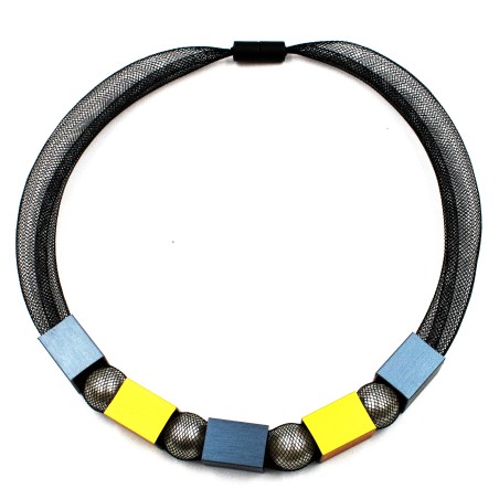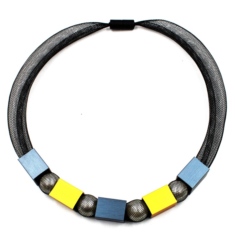 This clever contemporary necklace blends softness and boldness in one striking design. A delicate mesh sleeve holds smooth glass pearls for a classic, elegant feel, while brightly anodized aluminum cubes on the outside add a vibrant, assertive twist. Light, modern, and full of personality, it’s finished with a secure magnetic closure for effortless everyday wear. A perfect balance of refined and daring style.