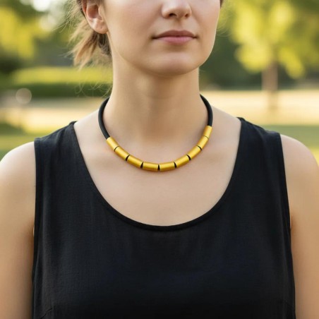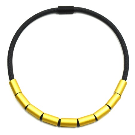 This minimalist necklace pairs simplicity with striking color: nine anodized aluminum cylinders in varied hues create a quietly elegant, modern statement. Each lightweight cylinder adds a touch of sculptural presence without overwhelming the neckline. The silky‑soft cord offers exceptional comfort for all‑day wear, and the strong magnetic clasp makes fastening effortless. A contemporary, artful accessory for anyone who appreciates refined design, vibrant color, and thoughtfully crafted jewelry.