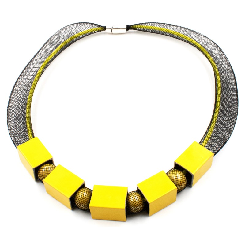 This clever contemporary necklace blends softness and boldness in one striking design. A delicate mesh sleeve holds smooth glass pearls for a classic, elegant feel, while brightly anodized aluminum cubes on the outside add a vibrant, assertive twist. Light, modern, and full of personality, it’s finished with a secure magnetic closure for effortless everyday wear. A perfect balance of refined and daring style.