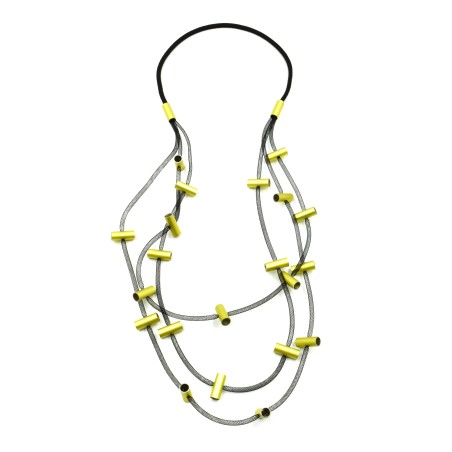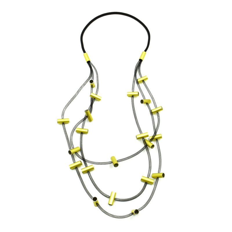 A very popular design made of anodized aluminum cylinders mounted on mesh threads for a long (32") easy to wear silhouette.