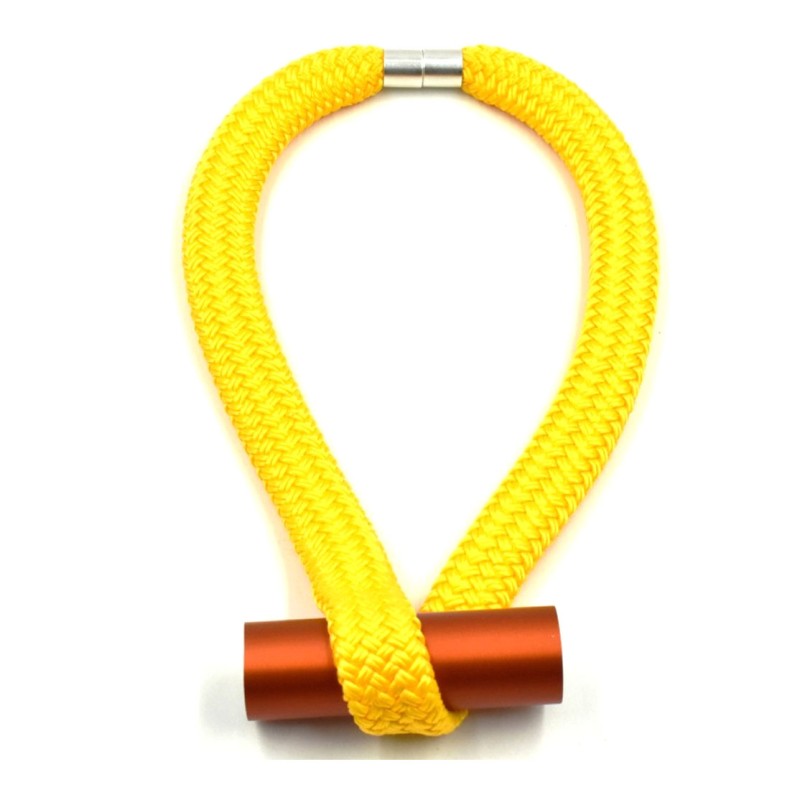 The contrast between the smooth textile and the vibrant anodized aluminum gives the piece a refined, sculptural presence—lightweight, modern, and unmistakably artistic. Perfect for anyone who loves minimalist jewelry with a bold, innovative twist, this design proves that it truly doesn’t get more contemporary than this.