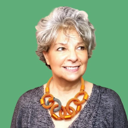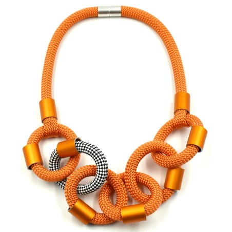 This contemporary 22" necklace features a single row of thick cotton links accented with sleek anodized‑aluminum cylinders. Its cascading design showcases vibrant, scrumptious colors that add a bold yet refined touch to any outfit. Lightweight, modern, and effortlessly stylish, it’s the perfect statement piece for elevating everyday looks or completing a chic, polished ensemble.