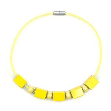 This clever contemporary necklace blends softness and boldness in one striking design. A delicate mesh sleeve holds smooth glass pearls for a classic, elegant feel, while brightly anodized aluminum cubes on the outside add a vibrant, assertive twist. Light, modern, and full of personality, it’s finished with a secure magnetic closure for effortless everyday wear. A perfect balance of refined and daring style.