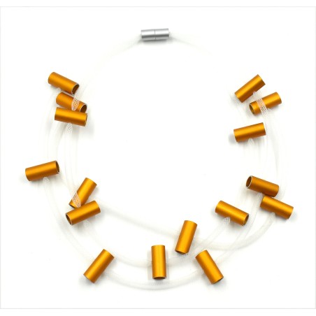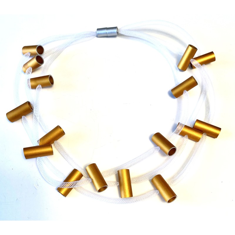 This is a light and summery 20" design with featherlight transparent mesh cords that make this design so unique and easy to wear, and deep-colored anodized aluminum cylinders. It has a magnetic closure.