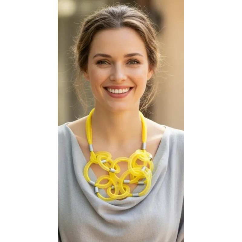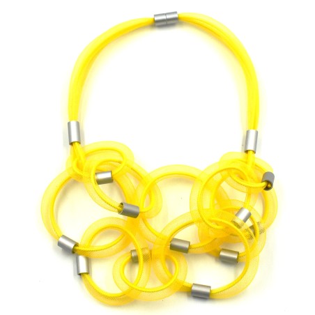 Experience modern elegance with this sophisticated 24" necklace, featuring transparent mesh loops anchored by a deeply colored inner cord for a striking 3D effect. Light as a feather yet visually distinctive, it offers beautiful floating movement that adds effortless grace to any outfit. Finished with a secure magnetic closure, this contemporary design blends texture, depth, and airy refinement for a look that stands out with subtle sophistication.