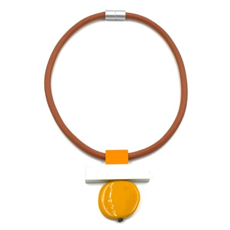 Suspended from a silky cord in a complementary hue, this lightweight necklace offers effortless comfort and a refined, modern aesthetic. Perfect for everyday wear or adding a subtle artistic touch to more polished looks, it showcases the beauty of anodized aluminum combined with tactile, glass‑like acrylic in a fresh, contemporary way