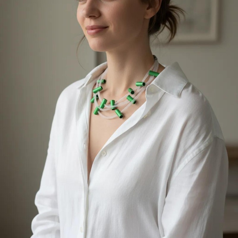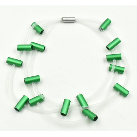 This is a light and summery 20" design with featherlight transparent mesh cords that make this design so unique and easy to wear, and deep-colored anodized aluminum cylinders. It has a magnetic closure.