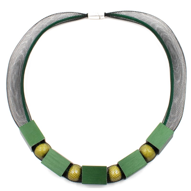 This clever contemporary necklace blends softness and boldness in one striking design. A delicate mesh sleeve holds smooth glass pearls for a classic, elegant feel, while brightly anodized aluminum cubes on the outside add a vibrant, assertive twist. Light, modern, and full of personality, it’s finished with a secure magnetic closure for effortless everyday wear. A perfect balance of refined and daring style.