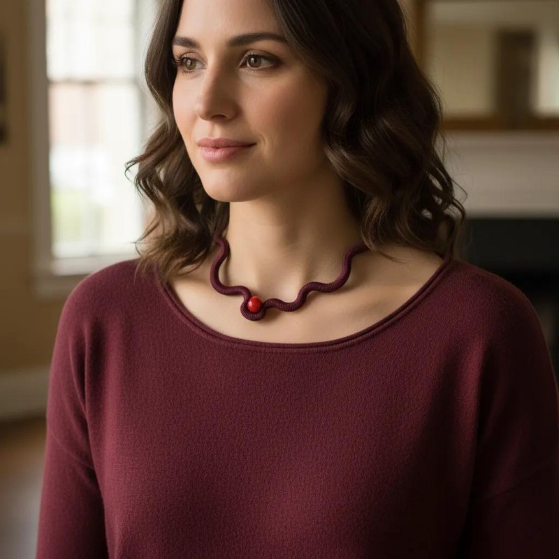 Embrace effortless style with this contemporary necklace, featuring a soft, gently waving cord shaped by an invisible internal support. An off‑center ceramic bead adds a touch of artistic flair, making it the perfect accessory for casual days when you want a simple look with attitude. Lightweight, modern, and uniquely expressive, this piece brings subtle sophistication to any outfit.