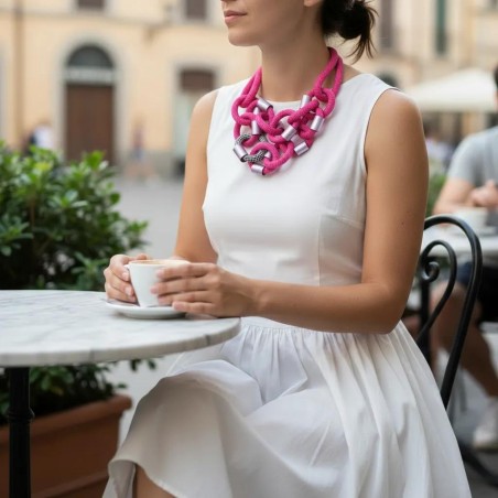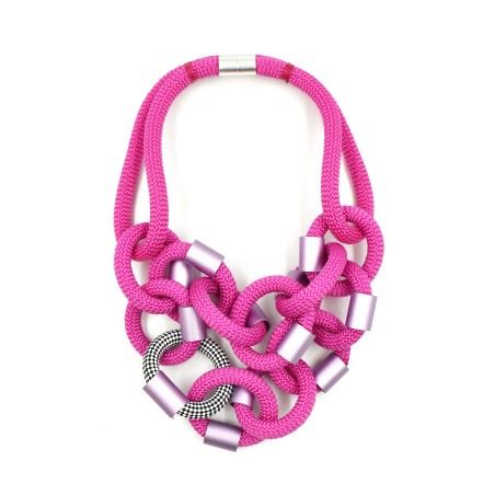 Make a bold yet elegant statement with this stunning 24" necklace, featuring two strands of thick cotton links accented with sleek anodized‑aluminum cylinders. The cascading design showcases rich, scrumptious colors that add depth and movement to any outfit. Lightweight, contemporary, and effortlessly stylish, this necklace is the perfect accessory for elevating both casual and dressy looks.