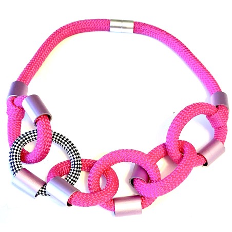 This contemporary 22" necklace features a single row of thick cotton links accented with sleek anodized‑aluminum cylinders. Its cascading design showcases vibrant, scrumptious colors that add a bold yet refined touch to any outfit. Lightweight, modern, and effortlessly stylish, it’s the perfect statement piece for elevating everyday looks or completing a chic, polished ensemble.
